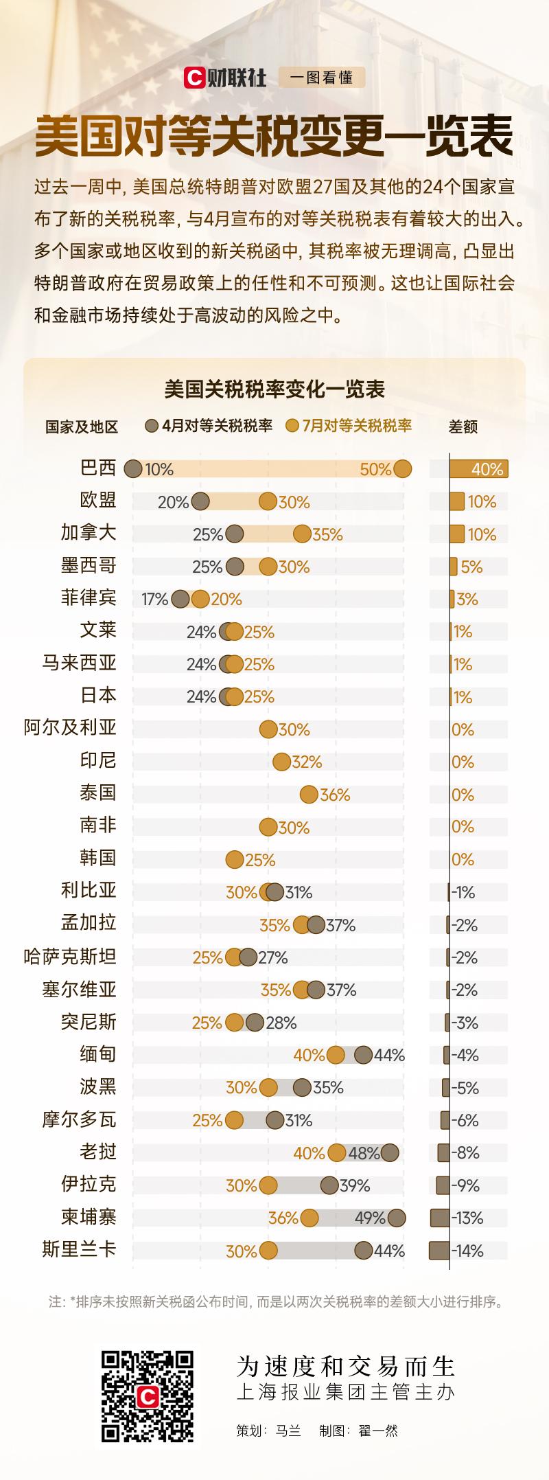 财联社7月14日讯(编辑 马兰)美国总统特朗普日前宣布将在8月1日开始,对全球贸易伙伴征收新的关税税率,其较4月宣布的对等关税税率有了较大的变化,这也让市场再次陷入对美国政府的迷惑和担忧之中。