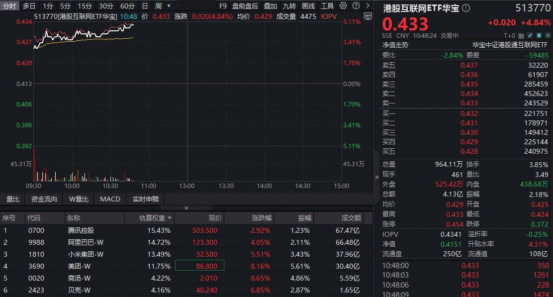 港股AI核心工具——港股互联网ETF华宝(513770)场内价格冲击5%,成交快速突破4亿元。